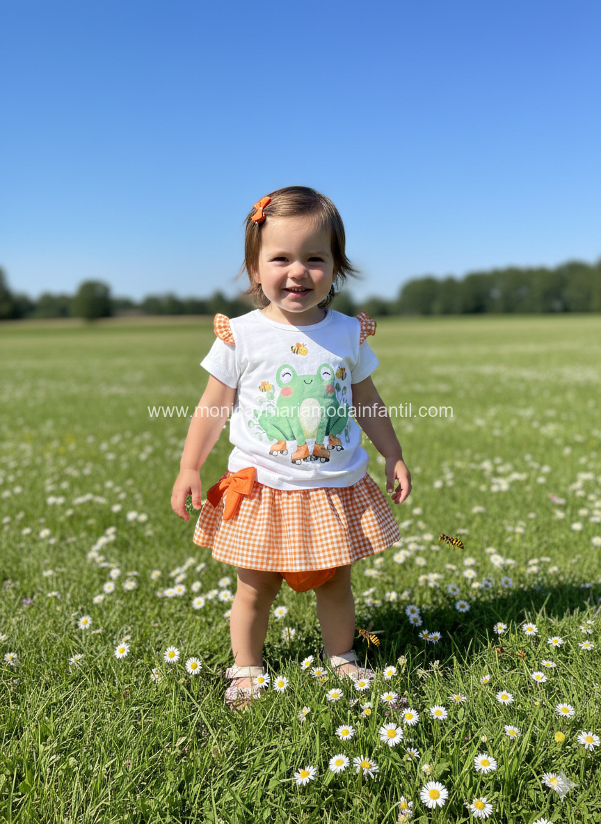 • Camiseta: De color blanco con mangas cortas adornadas con volantes en cuadro vichy naranja. Presenta un simpático diseño central de una ranita verde en patines, acompañada de pequeñas abejas.