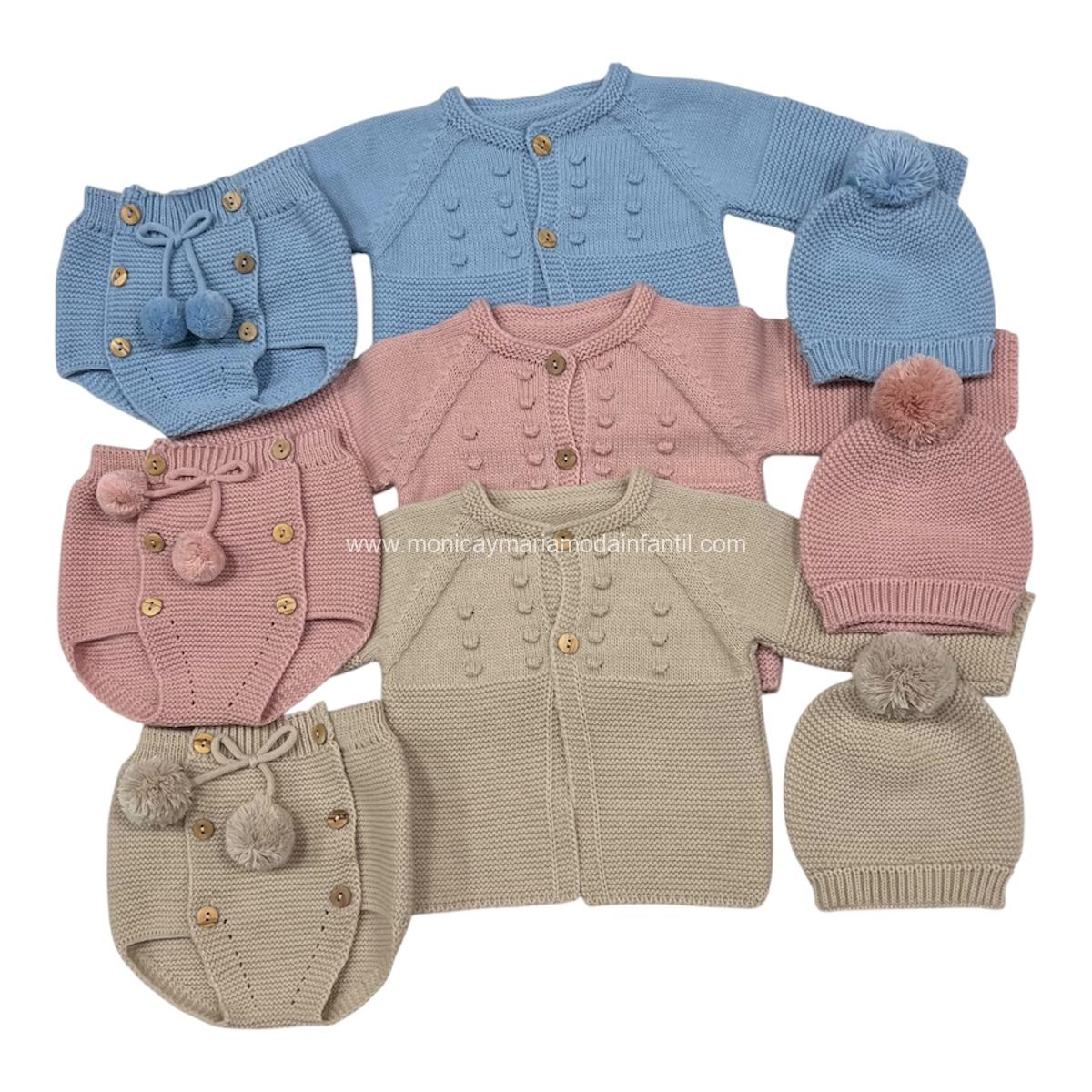 Conjuntos de bebé 3 piezas, tacto muy agradable y cómodo. Cubre pañal, chaqueta y gorro con borlón.