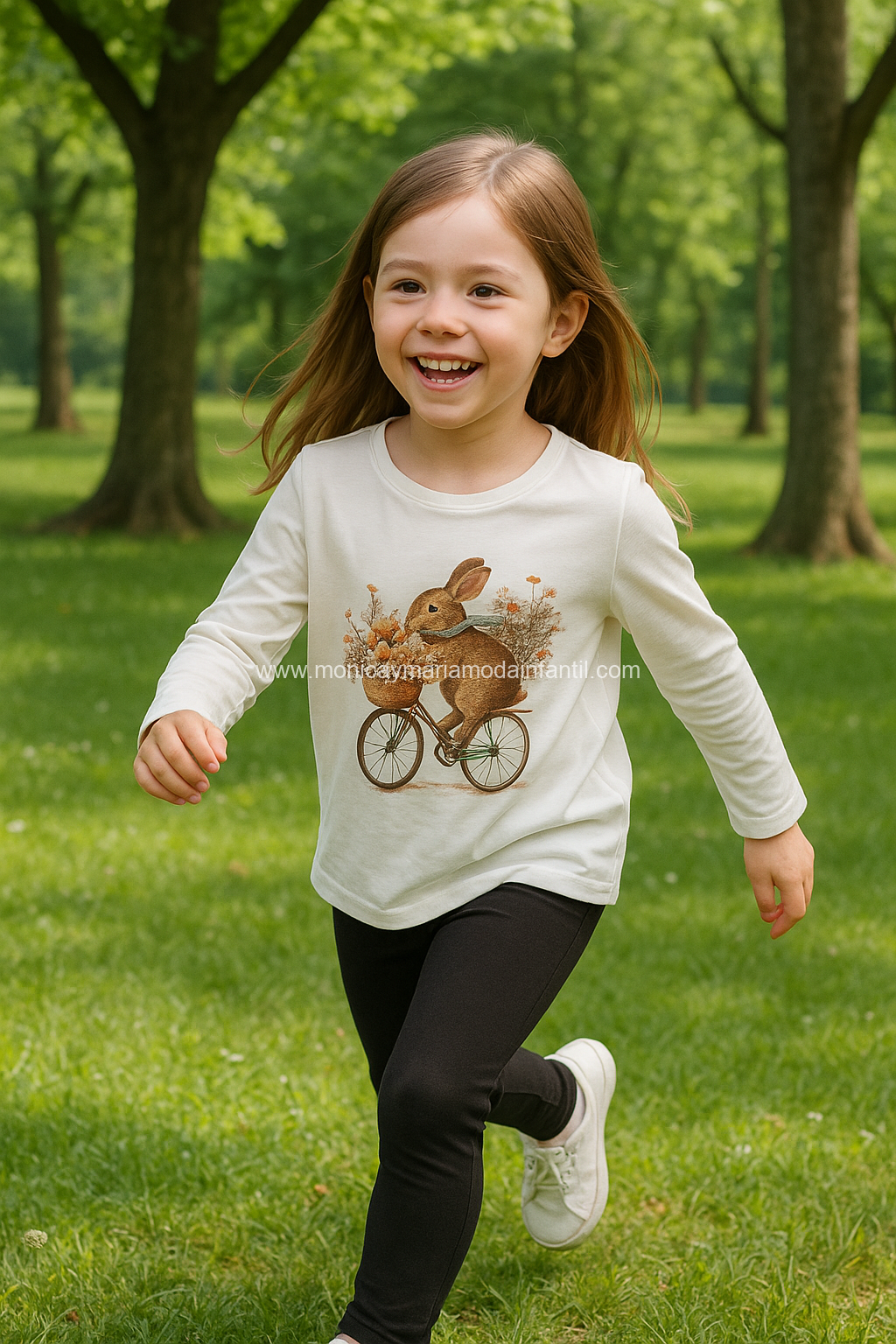 Conjunto cómodo.Camiseta blanca con un adorable estampado de un conejito montado en una bicicleta con una canasta de flores, combinada con leggings marron.